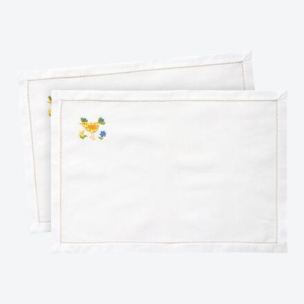 Erstklassige Tischsets handbestickt Dekorativer Hohlsaum Dichtes Gewebe aus langstapeliger Baumwolle Bunte Hühner-Motive in verschiedenen Sticktechniken Plastische Darstellung der Hühner und Blümchen Jedes Teil handgefertigt Tischdekoration vom Feinsten bietet die Premium-Tischwäsche, die sorgfältig mit Liebe zum Detail von Hand mit bunten Hühnern und Blümchen bestickt wurde Dafür wurden die flächigen Motive im Plattstich in die Tischsets gestickt Feine Details wie die Blütenstengel und die Hühnerbeine sind wie gedrehte Schnüre im Stielstich gearbeitet So ist jedes Teil ein handwerkliches Unikat Je nach Lichteinfall erscheinen die Darstellungen geradezu plastisch und lebendig Die Tischwäsche ist aus einem sehr feinen und dichten Gewebe aus langstapeliger Baumwolle mit dekorativem Hohlsaum aus behutsam gezogenen Fäden gefertigt.