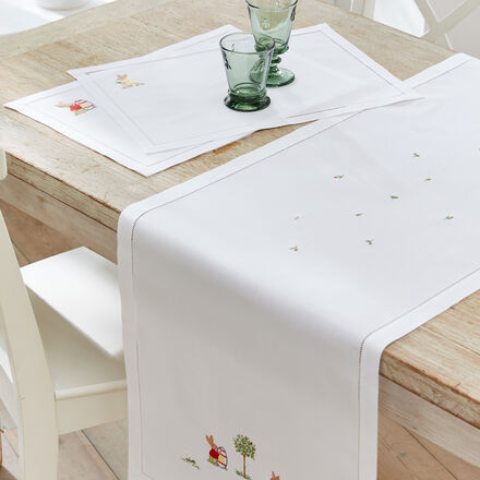 Feine Tischwäsche für die Osterzeit Erstklassige Tischsets handbestickt Dekorativer Hohlsaum Dichtes Gewebe aus langstapeliger Baumwolle Plastische Hasenmotive in verschiedenen Sticktechniken Jedes Teil handgefertigt Sorgfältig gearbeitet mit doppelt gelegtem Saum und Couvertecken Tischdekoration vom Feinsten bietet die Premium-Tischwäsche, die sorgfältig mit Liebe zum Detail von Hand mit einem feinen Motive mit Hasen für die Osterzeit bestickt wurde Dafür wurden die flächigen Motive in die Servietten im Plattstich gestickt Feine Details wie die Blütenstengel sind wie gedrehte Schnüre im Stielstich gearbeitet So ist jedes Tischset ein handwerkliches Unikat Je nach Lichteinfall erscheinen die Darstellungen geradezu plastisch und lebendig Die Tischwäsche ist aus einem sehr feinen und dichten Gewebe aus langstapeliger Baumwolle mit dekorativem Hohlsaum aus behutsam gezogenen Fäden gefertigt.