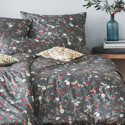 Veredelte Premium Satin-Bettwäsche Nachhaltig produziert, GOTS-zertifiziert Feinste, hautfreundliche Bio-Baumwolle Allover Vogel-Dessin auf dunkelgrauem Grund Tischwäsche im gleichen Dessin bestellbar Kissenbezug 40 x 80 cm separat bestellbar Das Motiv mit heimischen Vögeln – Rotdrossel, Dompfaff und Distelfink -, Heckenrosen und Hagebutten auf edlem, dunklem Grund hat uns begeistert Daher bieten wir Ihnen eine Premium Satin-Bettwäsche mit diesem eindrucksvoll illustrierten Allover-Motiv an Die Bettwäsche ist aus einem merzerisierten Baumwoll-Satin gefertigt Umwelt- und ressourcenschonend hergestellt, hochwertig verarbeitet und zertifiziert nach GOTS und OEKO-TEX® STANDARD 100 entspricht sie höchsten Ansprüchen und Standards und sorgt gleichzeitig für einen erholsamen Schlaf Der merzerisierte Premium Satin besteht aus 100 % atmungsaktiver Bio-Baumwolle.