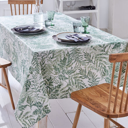 Unkomplizierte Tischwäsche Wasser- und fleckabweisend Dezentes Farndekor passt zu vielen Geschirrfarben Geeignet für den täglichen Gebrauch Pflegeleicht und robust Abwaschbar Die Acryl- Ausrüstungen geben dem Gewebe Schutz und verhindert das Eindringen von Flüssigkeiten und Flecken. Die robusten Tischdecken eignen sich daher für den täglichen Dauereinsatz. Passiert mal ein Malheur, reicht ein einfaches Abtupfen und der Schaden ist behoben. Die Beschichtungen bleiben auch beim Waschvorgang erhalten, danach sind die Tischdecken wieder wie neu. Dabei bleibt die natürliche Haptik des glatt aufliegenden, strapazierfähigen Materials erhalten. Die angesagte dezente Farnoptik des Dekors passt prima zu vielen Geschirrfarben. 80% Baumwolle 20% Polyester im Digitaldruck in unterschiedlichen Grüntönen. Feinwäsche 40 °C, von links bügeln.