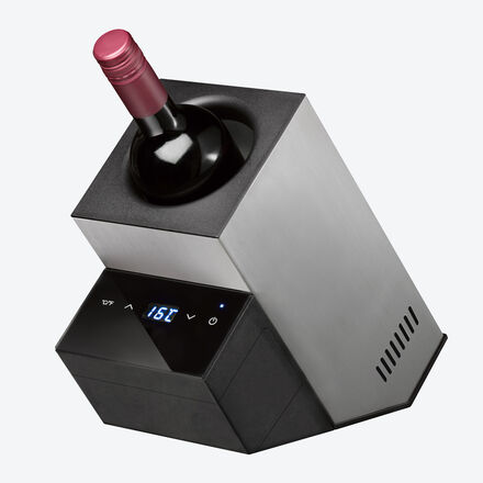 Hochwertiger Design-Weinkühler Akku- und Netzbetrieb möglich Kühlt Flaschen bis Ø 9 cm Temperatur einstellbar von 5-18° C Sensor-Touch-Bedienung Mit diesem hochwertigen Weinkühler genießen Sie Getränke auf Wunschtemperatur. Dank thermoelektrischer Kühlung hält das Gerät die in 1 °C-Schritten wählbare Temperatur (5-18 °C) konstant – selbst bei hoher Umgebungstemperatur. Der leistungsstarke Akku (bis zu 120 Minuten Laufzeit) oder der Netzbetrieb sorgen für zuverlässige Kühlung – ganz flexibel am Esstisch, auf dem Balkon, im Garten oder beim Picknick. Gut vorgekühlte Flaschen vermeiden lange Kühlzeiten. Der Flaschenkühler fasst alle gängigen Wein-, Sekt- und Wasserflaschen bis Ø 9 cm. Korpus Edelstahl/Kunststoff, 13,5 x 24,5 x 28,5 cm (B/T/H), wiegt 3,4 kg, rutschfest gummierte Füße, Sensor-Touch-Bedienung, LED-Display, 240V/72W.