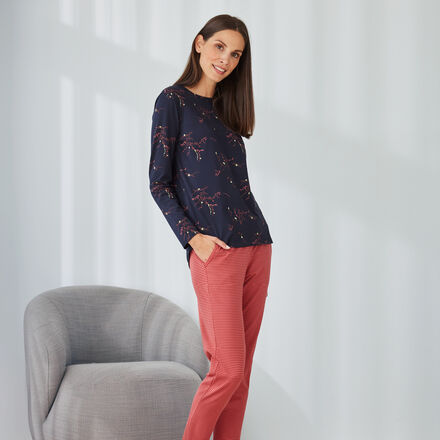 Fein geringelte Pyjamahose für Mix & Match Schlafanzug Mit Gummibund und 2 Eingrifftaschen Terracotta Zeitlos schön Hautschmeichelnde, zertifizierte Baumwolle Gehört zu einer feinen Mix & Match Kollektion Die fein geringelte Pyjamahose in Terracotta harmoniert hervorragend mit den anderen Teilen der Nachtwäsche-Serie mit feinem Korallenaufdruck Stellen Sie sich die einzelnen Teile nach Ihren persönlichen Vorlieben zusammen Der formstabile, hautsympathische Single-Jersey schmeichelt Ihrer Haut ganz besonders und lässt Sie gut und beruhigt schlafen Die GOTS-Zertifizierung gewährleistet nämlich weltweit anerkannte Standards Der Elasthananteil macht die Kollektionsteile wunderbar dehnbar und formstabil Die geringelte Pyjamahose ist mit einem Gummibund und 2 Eingrifftaschen ausgestattet, die Hosenbeine werden nach unten hin schmaler Kombinieren Sie dazu die beiden Langarmshirts Navyblau mit Korallenprint (Nr 413HZ04) oder Terracotta unifarben (Nr 413HZ05).