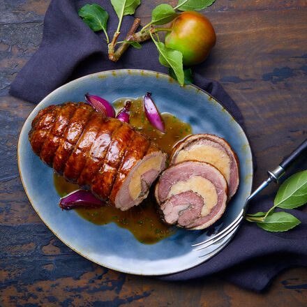 Gänsebrust mit aromatischer Semmelknödelfüllung Sous-vide vorgegart nur noch fertig backen Gelingt außen knusprig, innen saftig Deutsche Freilandgans aus artgerechter Haltung Optisch ein festlicher Genuss Zubereitung: Die geschlossene Verpackung in heißes Wasser legen, um anhaftenden Bratensaft zu verflüssigen Aufschneiden, austretende Flüssigkeit auf die Backofen Fettpfanne abtropfen lassen Den entnommenen Braten trockentupfen 2 Schalotten und 1 Knoblauchzehe fein gewürfelt mit 200 g geviertelten Champignons in die Fettpfanne geben Einen entkernten, in Spalten geschnittenen Apfel und etwas Thymian zufügen Den Braten dazulegen Fettpfanne auf die mittlere Einschubhöhe, in den auf 180 °C (Ober- und Unterhitze) vorgeheizten Backofen setzen Nach 30 Minuten Bratzeit 200 ml Wasser in die Fettpfanne geben Während weiteren 30 Minuten immer wieder mit der Bratflüssigkeit beträufeln Braten herausnehmen und warmstellen.