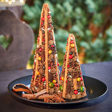 Bunt mit Perlen, Beeren und Tannenzapfen geschmückt, erfreuen die sorgfältig in Handarbeit gefertigten Gewürzbäumchen nicht nur das Auge: Sternanis und Zimtstangen verströmen einen wunderbar weihnachtlichen, belebenden Duft.