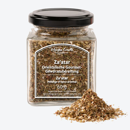 Würzige Kräuter- und Sesam-Aromen Nussig mit frisch-herber Zitrusnote Für Grill- und Schmorgerichte, Couscous, Reis, Gemüse, Brot Rein natürliche Zutaten, ohne Zusatzstoffe Nach strengen Hagen Grote Kriterien, wie natürlicher Kultivierung, erfolgt die weltweite Gewürzauswahl. Perfekt stimmen unsere Gewürzspezialisten feine orientalische Gewürze wie Sesamsaat, gemahlene Sumachfrüchte, Thymian und Oregano zu dieser harmonischen Mischung aufeinander ab. Mit ihren würzigen Kräuter- und Sesam-Aromen bringt sie orientalischen Zauber in Ihre Gerichte. Perfekt als Rub für Fisch und Fleisch, würzt sanft Gemüse und Reis. Ergibt mit etwas Olivenöl vermischt einen wunderbaren Dip. Je nach Geschmack reichen 2-3 TL auf 100 ml Öl. Rein natürliche Zutaten, frei von Geschmacksverstärkern und Konservierungsstoffen. Gewürzglas 8 cm hoch, 6,2 cm breit, 6,2 cm tief (mit Deckel) Hagen Grote Exklusiv
