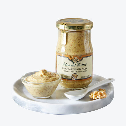 Echter grober Dijon-Senf Aus seltenen schwarzen Senfsamen Angenehme, feine Senfschärfe Verfeinert mit Walnuss Bereichert Fleischgerichte, Saucen, Vinaigrettes Seit 1840 fertigt Edmund Fallot feinsten Dijon-Senf. Sein Walnuss-Dijon-Senf ist eine besondere Spezialität. Aus seltenen schwarzen Senfsamen und der natürlichen Veredelung mit feiner Walnuss entsteht dieser grobe Dijon-Senf mit angenehm milder Senfschärfe. Die handgefertigte Delikatesse aus Frankreich bereichert Vinaigrettes, Saucen und Fleischgerichte und verleiht ihnen eine besondere, nussige Note. Rein natürliche Zutaten, ohne jegliche Farb- und Konservierungsstoffe.