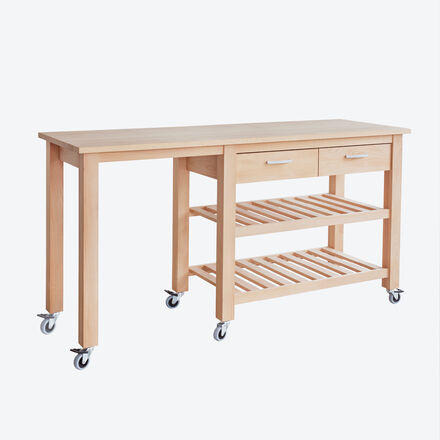 Erstklassige Schreinerarbeit für höchste Qualität Robuste Massivholz-Arbeitsfläche Platz zum Sitzen und praktischer Stauraum Mit zwei Schubladen Hochwertiges Vollholz und erstklassige handwerkliche Fertigung machen diese grundsoliden, schönen Küchenmöbel für lebenslangen Gebrauch unverwüstlich. Die robuste Arbeitsfläche aus 2,5 cm starkem Massivholz bietet eine ideale Arbeitsflächenhöhe von 90 cm. Mit Küchenhockern verwandeln Sie die Kücheninseln zur Essbar. Passende Aufbewahrungs-Weidenkörbe lassen sich ergänzen. Buche massiv, Griffe Edelstahl, 175 x 60 x 90 cm (B/T/H), zwei Schubladen, kommt mit Leichtlaufrollen. Design und Herstellung Hagen Grote Exklusiv
