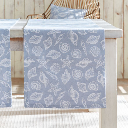Maritimer, jacquardgewebter Tischläufer Eingewebte Motive von Muscheln und Seesternen In Beige oder Blau Pflegeleichtes Baumwoll-Mix-Gewebe Hergestellt in Deutschland Die Jacquard gewebten Muscheln, Seesterne und Meeresschnecken in zarten Farbtönen passen in jedes gepflegte Strandhaus. Alle Kollektionsteile lassen sich super kombinieren und passen bestens ins maritime Farbschema und zu natürlichen Materialien. Der Tischläufer lockert den gedeckten Tisch charmant auf. Mixen Sie blaue und beige Teile der Tischwäsche-Kollektion, zu der noch Tischsets 2 Stück (Nr. 114HB12), Tischdecken in 3 Größen (Nr. 114HB14) und eine Kissenhülle mit Reißverschluss (Nr. 124HB04) gehören. Pflegeleichtes, angenehm weiches Baumwoll-Mix-Gewebe. 70 % Baumwolle, 30 % Polyester, waschbar bei 30 °C. Mit Sorgfalt hergestellt und verarbeitet in Deutschland.