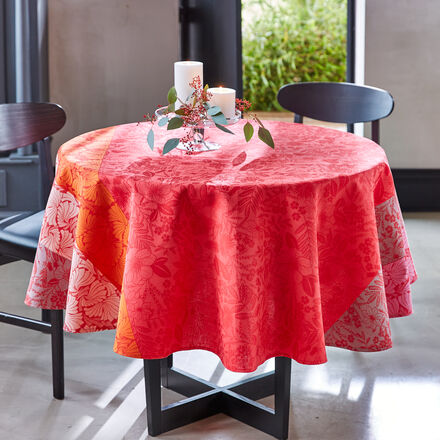 Hochwertig gefertigte Jacquard-Tischdecke Mit typischen Landhaus-Blumen Kunstvolles Dessin in verschiedenen Rottönen Besonders feine Baumwoll-Qualität Reißfest, stabil und formstabil Aus französischer Traditionsweberei Diese jaquardgewebte Tischdecke mit breiter Bordüre bringt ordentlich Farbe in Ihren Alltag Das Muster mit typischen Landhaus-Blumen und Akanthus mit seinen typischen miteinander verwachsenen Klechblättern präsentiert sich darauf ganz natürlich und zeitlos schön in verschiedenen Rottönen Die Tafeldecke wird in einer französischen Traditionsweberei mit fast 50 Jahren Erfahrung gefertigt Das Garn wird aus langstapeliger, gekämmter Baumwolle hergestellt Mit einer Grammage von 205g/m² ist es leicht, aber gleichzeitig so stark, dass das zarte Jacquardgewebe äußerst reißfest und stabil ist Alle Teile behalten auch nach vielfachem Gebrauch ihre Proportionen In gleicher Qualität und gleichem Dessin bieten wir Ihnen einen Tischläufer im Format 50 x 150 cm an (Nr.