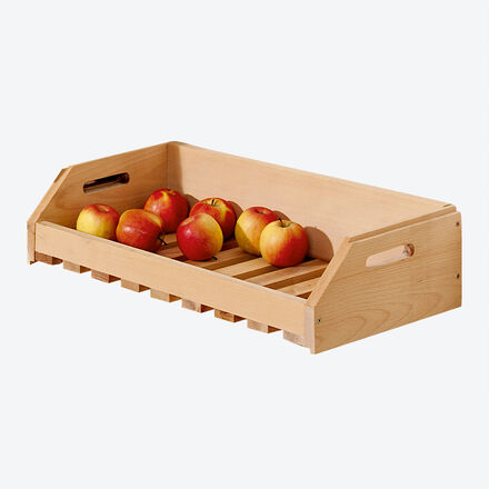 Mobil, platzsparend, gut belüftet. Nutzen Sie mit dem mobilen Stapelregal jede freie Nische als zusätzlichen Lagerplatz. Weinflaschen liegen darin wohlgeordnet und sicher in Flaschenhals-Ausschnitten. Durch ausreichenden Abstand zum nächsten Regalaufsatz lassen sie sich überall beliebig entnehmen. In den Lebensmittelfächern lagern Sie Obst, Gemüse und andere Vorräte übersichtlich und gut erreichbar. Bodenleisten fördern die freie Belüftung, gefräste Nutverbindungen ermöglichen sicheres Stapeln ohne Verrutschen, seitliche Griffe erleichtern den Transport. Massive unbehandelte Buche, 60 x 30 x 16 cm hoch, wiegt 2,5 kg, feste Schraubverbindungen für dauerhaften Gebrauch, bis zu 10 Stück übereinander sicher stapelbar und je bis 25 kg belastbar.