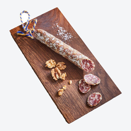 Original provenzalische Salami Luftgetrocknet und schimmelgereift Handwerklich hergestellt Frei von künstlichen Aromen und Zusatzstoffen Auf 1937 datiert das bis heute geheime Originalrezept der Familie St. Martin für beste, luftgetrocknete und schimmelgereifte provenzalische Salami aus handwerklicher Herstellung. Das Fleisch stammt aus Freilandschweinezucht am Mont Ventoux, wo die Tiere rund um den Glockenturm von Sault auf mindestens 800 Metern Höhe leben und ausschließlich mit Getreide gefüttert werden. Drei Geschmacksrichtungen entführen Sie mit ihren Aromen nach Südfrankreich, ob mit einem Mantel aus Kräutern der Provence, echt provenzalischen Walnüssen oder mit Lavendel und Lavendelhonig verfeinert. Rein natürliche Zutaten, frei von künstlichen Aromen und Zusatzstoffen. Je 135 g.