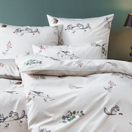Edle Mako-Satin-Bettwäsche Mit feinen Tierillustrationen aus dem Wald Feinfädig, dicht gewebter Baumwoll-Satin Leichte Textur, angenehm auf der Haut Kissenbezug mit dekorativer Paspel Kissenbezug 40 x 80 cm separat bestellbar Genießen Sie einen erholsamen Schlaf in feinster Mako-Baumwolle Die Bettwäsche ist aus 100 % hochwertiger Mako-Baumwolle mit einem besonders feinen und dichten Satingewebe hergestellt Die große, weiße Fläche mit natürlich glänzender Oberfläche wirkt mit den kleinen Zeichnungen verschiedener Waldtiere ruhig und edel Der edle Mako-Satin mit leichter Textur ist äußerst angenehm auf der Haut und punktet mit allen Eigenschaften hochwertiger Baumwollfasern Mako-Satin ist feuchtigkeitsregulierend und atmungsaktiv, was ein angenehmes Schlafklima fördert Die hautsympathische Textur und die rein natürliche Beschaffenheit der Bettwäsche ist besonders für Menschen mit sensibler Haut wohltuend Kissenbezug mit dekorativer Paspel.