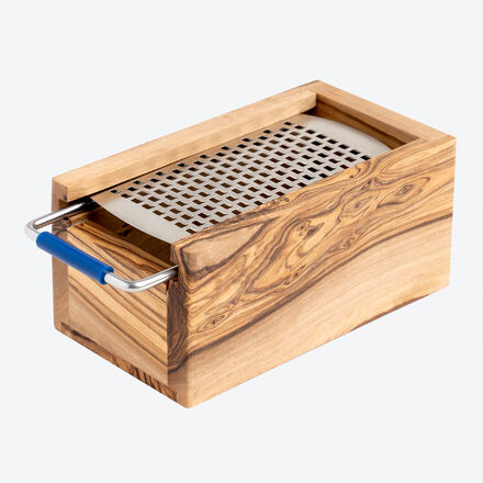 Messerscharfe Edelstahl-Reibe Ideal für Hartkäse, Schokolade, Nüsse Mit Olivenholz-Behälter zum Auffangen und Servieren Im aufwendigen Laser-Cut-Ätzverfahren verleihen wir den Edelstahl-Reibzähnen ihre hohe Schärfe. Ihr perfekter Schneidwinkel ermöglicht schnelles, leichtes Reiben auch größerer Mengen. Hochwertiger Olivenholz-Sammelbehälter, 15 x 8,5 x 7 cm (B/T/H), Reibe 16 x 7,5 x 1 cm mit Griff, Reibfläche 12,5 x 7 cm. Handreinigung zum dauerhaften Erhalt der Schärfe empfohlen.