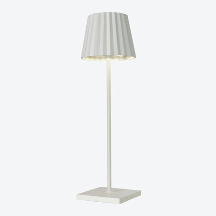 Kabellose LED-Tischlampe, flexibel einsetzbar Mit charakteristischem Plisseeschirm Akku einfach mit Ladestation aufladen Für drinnen, draußen und unterwegs Aus hochwertigem Aluminium mit Spritzwasserschutz Je nach Leuchtleistung 9 bis 24 Stunden pro Akkuladung Die dimmbare LED-Tischlampe mit dem charakteristischen Plissee-Schirm setzen Sie überall dort ein, wo Sie eine flexible Beleuchtung wünschen In fünf Farben ist die kabellose LED Tischleuchte nicht nur optisch eine Bereicherung für Ihre Einrichtung, dank ihrer Eigenschaften ist sie unkompliziert, unverwüstlich und unaufdringlich Robust aus Aluminium gefertigt eignet sich die Tischleuchte ohne Kabel für den Gebrauch drinnen und im Freien (IP54) Die kräftigen Akkus bieten je nach Leuchtintensität bis zu 24 Stunden kabelloses Licht Auf der Oberseite ist die Akku-Tischleuchte mit einem Touch-Sensor zum stufenlosen Dimmen und zur Wahl zwischen zwei Lichtfarben ausgestattet Aluminium, Schirm Ø 11 cm, 38 cm hoch, wiegt ca.