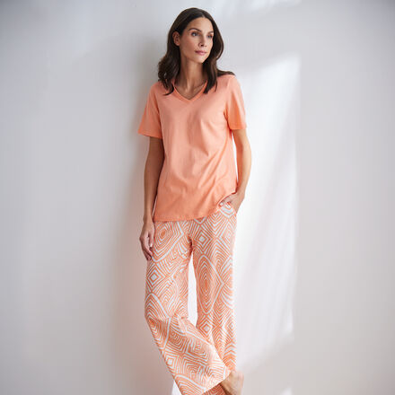 Kombinierfreudige Pyjamahose aus Baumwoll-Modal-Mix Mit schickem Grafikmuster in zwei Farbstellungen Besonders atmungsaktiv und angenehm zu tragen Weicher und elastischer Singlejersey Passt toll zu den unifarbenen Shirts der Kollektion Kombinieren Sie die Pyjamahose mit Grafikmuster mit den unifarbenen Shirts der Nachtwäschekollektion (Nr 414HA13) in Navy oder Apricot Wir bieten Ihnen in gleicher Qualität auch ein modisches Allrounder-Kleid (Nr 414HB11) aus der Kollektion mit schickem Grafikmuster an Der hochwertige Singlejersey aus einem Baumwoll-Modal-Mixist weich, hautsympathisch und elastisch Der Baumwollstoff mit Modalanteil ist besonders atmungsaktiv und brilliert mit exzellenter Optik und perfektem Sitz Die Pyjamahose ist ein schickes, modisches Modell für den Sommer als Schlafanzughose oder schicke Loungewear Praktisch und bequem ist der Gummizugbund und die seitlichen Eingrifftaschen.