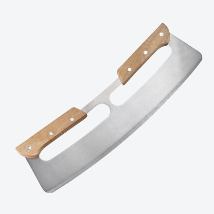 Extrascharfe Edelstahl-Klinge Sichere Handhabung Auch für Pinsa, Flammkuchen, Fladenbrot, Kräuter Kommt mit Klingenschutz Das gebogene Messer einmal hin und her bewegen, schon ist die Pizza exakt geteilt. Spielend leicht gleitet die scharfe Klinge, ohne zu quetschen, durch Belag und Teig. Im Gegensatz zum Pizzaroller bleibt der Belag, wo er hingehört. Nichts wird verschoben. Ergonomisch geformte, rutschfeste Holzgriffe erleichtern die sichere Handhabung. Schneidet auch Pinsa, Flammkuchen, Fladenbrote, hackt Kräuter. Edelstahl-Klinge mit Klingenschutz, 35 x 10 x 2,5 cm (B/T/H), zum Erhalt der Schärfe Handwäsche empfohlen.
