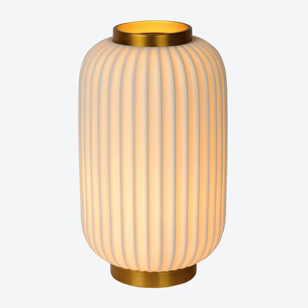 Kompakte Porzellan-Tischleuchte Im angesagten Art-Déco-Stil Design in origineller Lampionform Angenehm gedämpftes Licht Auf der Suche nach einer besonderen Tischleuchte im angesagten Art-Déco-Stil stießen wir auf diese Tischleuchte aus hochwertigem Porzellan mit messingfarbenen Metallrändern. Das zylindrische Design in Form eines japanischen Lampions verleiht der Lampe ihr charakteristisches Aussehen. Die kompakte Größe macht sie zu einem perfekten Allrounder. Die Lichtquelle streut ihr Licht nach oben und durch den Porzellanschirm. Dieses gedämpfte Licht erzeugt eine sehr angenehme Stimmung. Kann mit LED-Leuchtmittel verwendet werden. Porzellan weiß, Metall messingfarben, Ø 19,5 x 34 cm hoch, 1x25W / 230V, Leuchtenfassung E14 (Leuchtmittel nicht inklusive), Kabellänge 140 cm mit Kippschalter.
