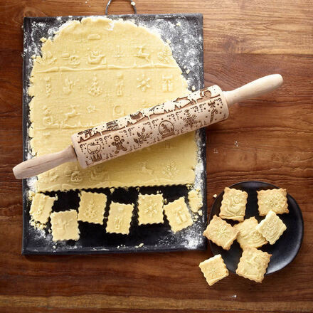 Plätzchenvielfalt mit einer Teigrolle Aus europäischem Buchenholz Prägt 24 Weihnachtsmotive in den Teig Auch ideal für Marzipan oder Fondant Per Laser-Gravur werden die detailgetreuen Motive in das europäische Buchenholz graviert. Dank leichtgängiger Metallachse übertragen sich die 2 mm tiefen Prägungen beim langsamen Rollen auf den zuvor konventionell ausgewalzten Plätzchenteig. Anschließend einfach mit einem Teigrad ausschneiden und backen. Die fertigen Kekse ziert ein dekoratives weihnachtliches Muster. Auch für Marzipan oder Fondant geeignet. Buchenholzrolle mit 24 Weihnachtsmotiven. Ø 5,5 cm, 45 cm lang, wiegt 500 g. Handwäsche empfohlen.