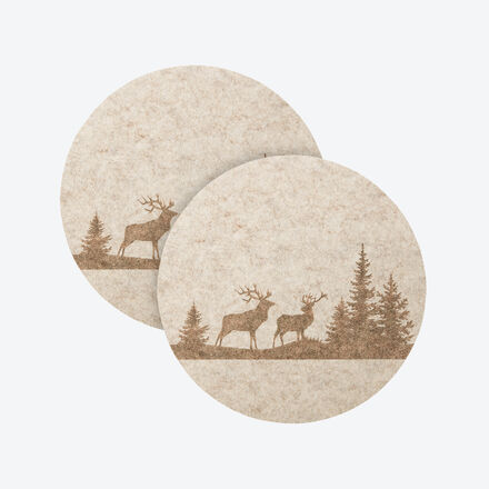 Runde Platzsets aus Acrylfilz Pflegeleicht feucht abwaschbar Schwere Qualität Waldmotiv mit 2 Hirschen Im modernen Landhaus-Look Optisch von klassischem Wollfilz nicht zu unterscheiden, überzeugt das robuste Kunststoffmaterial mit ausgesprochen pflegeleichten Eigenschaften. Einfaches Abwischen genügt, um kleine Malheurs bei Tisch unsichtbar zu machen. Geprägt mit 2 prachtvollen Hirschen im Tannenwald schützen die runden Tischsets wertvolle Oberflächen vor Kratzern, Feuchtigkeit sowie heißen Tellern und zaubern modernes Landhaus-Flair auf die rustikal gedeckte Tafel. 100 % Polyester.