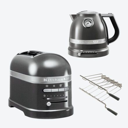 KitchenAid Toaster Stabiles Gussaluminium verspricht nahezu unbegrenzte Lebensdauer Dickwandige Heizplatten und automatische Zentrierung sorgen für gleichmäßig beidseitige Bräunung In die großzügig dimensionierten Schlitze (3,3 x 14,5 cm) passen übergroße Brotscheiben, reich belegte Sandwiches, aber auch halbierte Bagels Dank spezieller Funktion lassen sich Brötchen oder englische Muffins sogar von nur einer Seite bräunen Sandwiches gelingen, ohne zu tropfen Stufenloser Regler mit elektronischem Sensor für exakten Bräunungsgrad, automatische Abschaltung mit Signalton, separat schaltbare Doppelschlitze beim 4-Scheiben-Toaster, Auftaufunktion, Sandwichzange, Edelstahl-Krümelschublade, 220V/1250W, 1,4 m Anschlusskabel mit Kabelfach, geprüfte Sicherheit KitchenAid Doppelwand-Wasserkocher Stufenlos wählen Sie die Wassertemperatur von 50-100 °C für unterschiedlichste Zubereitungen.