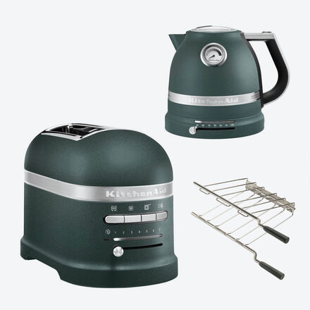 KitchenAid Toaster Stabiles Gussaluminium verspricht nahezu unbegrenzte Lebensdauer Dickwandige Heizplatten und automatische Zentrierung sorgen für gleichmäßig beidseitige Bräunung In die großzügig dimensionierten Schlitze (3,3 x 14,5 cm) passen übergroße Brotscheiben, reich belegte Sandwiches, aber auch halbierte Bagels Dank spezieller Funktion lassen sich Brötchen oder englische Muffins sogar von nur einer Seite bräunen Sandwiches gelingen, ohne zu tropfen Stufenloser Regler mit elektronischem Sensor für exakten Bräunungsgrad, automatische Abschaltung mit Signalton, separat schaltbare Doppelschlitze beim 4-Scheiben-Toaster, Auftaufunktion, Sandwichzange, Edelstahl-Krümelschublade, 220V/1250W, 1,4 m Anschlusskabel mit Kabelfach, geprüfte Sicherheit KitchenAid Doppelwand-Wasserkocher Stufenlos wählen Sie die Wassertemperatur von 50-100 °C für unterschiedlichste Zubereitungen.