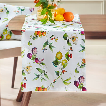 Sommerlicher Tischläufer Fein aquarelliertes Allover-Motiv Ressourcenschonender Druck Hochwertig verarbeitet und schadstoffgeprüft nach OEKO-TEX® STANDARD 100 Hergestellt in Deutschland Bio-Satin Bettwäsche mit dem gleichen Dessin passend bestellbar Saisonale Heimtextilien bringen Frische und Veränderung in Ihr Leben Das Motiv mit sommerlichen Früchten hat uns so gut gefallen, dass wir es Ihnen als Tisch- und Bettwäsche anbieten Die Abbildungen sind künstlerisch aquarelliert und werden ressourcenschonend aufgedruckt Auf dem pflegeleichten Tischläufer kommt das vielfarbige Allover-Dessin toll zur Geltung und dekoriert Ihr Esszimmer oder den Terrassentisch sommerlich frisch Hergestellt in Deutschland Die Tischwäsche-Serie mit Tischläufer, Tischdecken (Nr 114HB06) und passender Kissenhülle mit Reißverschluss (Nr 124HB01) setzt schöne jahreszeitliche Akzente Wir bieten Ihnen eine nachhaltig gefertigte Satin-Bettwäsche mit demselben Dessin an (Nr614HB31).