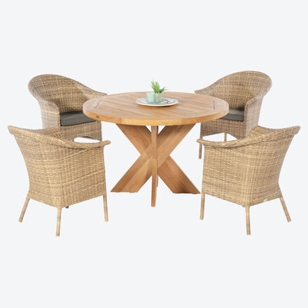 Zeitlos schöne Formen, das wetterbeständige Material, harmonische Farben und hochwertige Verarbeitung gehen beim Geflechtsessel und Teaktisch eine Symbiose auf höchstem Niveau ein. Gemütlich ist der klassische Sessel mit wetterbeständigem Loomgeflecht um ein pulverbeschichtetes Aluminiumgestell. Farblich harmonisch passt der traumhafte schön designte runde Tisch aus Teak dazu. Markant seine elegante Unterkonstruktion, hochwertig die Tischplatte aus Hartholz Teak mit attraktiver Maserung. Mit spezieller Reinigung und Pflege erhalten Sie die gold-braune Farbe des Teakholzes. Sessel: Gestell Aluminium pulverbeschichtet, wetterbeständiges Kunststoffgeflecht, Farbe: Natur antik, Kissenfarbe: braun, Kissenbezug: 100% Polyester, Füllung: Schaumstoff 100 % Polyurethan, mit Reißverschluss, Handwäsche. Tisch: Old Teak, recycled. Sessel und Tisch sind wetterbeständig.