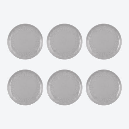 6 Teller ø 27,5 cm aus Hartporzellan Feines Dekor-Stäbchenrelief Passt zu vielen Tischwäschen Mikrowellengeeignet Spülmaschinenfest Das Geschirr mit dem feinen Stäbchenrelief wurde 1870 erstmalig unter der Porzellanmarke Königlich Tettau produziert. Mit dezentem Dekor passend es zu vielen Tischwäschen. Die Glasuren in klassischem Weiß und den sanften Pastelltönen Rosé und Silbergrau bieten die perfekte Wahl für eine zeitgemäße Optik, besonders wenn Sie die Farben miteinander kombinieren. Hartporzellan, gebrannt bei 1.450 °C, mikrowellengeeignet.