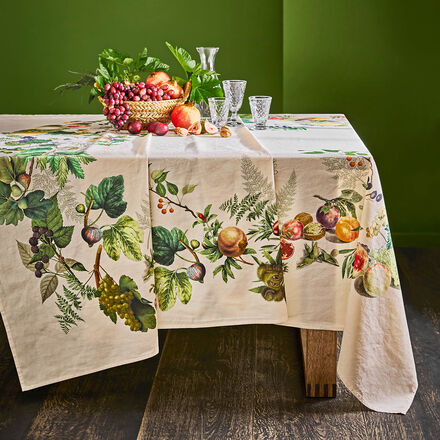 Tischdecke aus Naturfasern 50 % Baumwolle, 50 % Leinen Edle Struktur, weiche Haptik Fruchtmotiv Sorgfältig mit Briefecken verarbeitet Manufakturarbeit aus Frankreich Pflegeleicht, trocknergeeignet Seit 1833 wird in einer familiengeführten Weberei in den Vogesen feinste Tischwäsche gefertigt – mit Liebe zum Detail, handwerklichem Können und Gespür für zeitlose Schönheit Das Material vereint die weiche Pflegeleichtigkeit von Baumwolle mit der edlen Struktur und Strapazierfähigkeit von Leinen Ein natürlich schönes, langlebiges Gewebe mit lässigem Fall und zeitlosem Charme – ideal für Alltag und besondere Anlässe Das dekorative Fruchtmotiv mit Granatäpfeln, Feigen, Weintrauben, Oliven, Maronen und Honigmelonen bringt Farbe und Lebensfreude auf den Tisch Die Tischdecke aus Naturfasern ist mit Briefecken gearbeitet, der Stoff wurde für angenehme Weichheit und eine charmant lässige Optik vorgewaschen In gleicher Qualität und gleichem Dessin bieten wir einen Tischläufer an (Nr.
