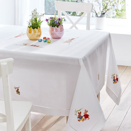 Handbestickte, feine Hohlsaum-Tischwäsche Österliche Motive in verschiedenen Sticktechniken Plastische Darstellung der Hasenfiguren und Blütenstiele Jedes Teil handgefertigt Sorgfältig gearbeitet Mit Sorgfalt und viel Liebe zum Detail werden diese Servietten von Hand mit niedlichen Osterhasen bestickt. Für flächige Motive kommt die schon seit dem Mittelalter bekannte Technik des „Plattstichs“ zum Einsatz. „Stielstiche“, die wie gedrehte Schnüre wirken, stellen die Blütenstiele dar. Bei wechselndem Lichteinfall erscheinen die Darstellungen plastisch und geradezu lebendig. Grundlage ist ein feines und dichtes Gewebe aus langstapeliger Baumwolle mit aufwendigem Hohlsaum. Doppelt gelegte Säume und Ecken in Couverttechnik schließen die hochwertigen Servietten ab. Jedes Teil ist ein handgefertigtes Unikat. 100 % Baumwolle, 160 g/m², Maschinenwäsche 40 °C empfohlen.