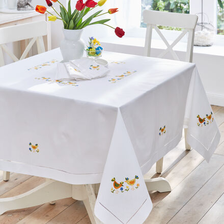Erstklassige Tischdecke handbestickt Dekorativer Hohlsaum Dichtes Gewebe aus langstapeliger Baumwolle Bunte Hühner-Motive in verschiedenen Sticktechniken Plastische Darstellung der Hühner und Blümchen Jedes Teil handgefertigt Tischdekoration vom Feinsten bietet die Premium-Tischwäsche, die sorgfältig mit Liebe zum Detail von Hand mit bunten Hühnern und Blümchen bestickt wurde Dafür wurden die flächigen Motive im Plattstich in die Tischdecke gestickt Feine Details wie die Blütenstengel und die Hühnerbeine sind wie gedrehte Schnüre im Stielstich gearbeitet So ist jedes Teil ist ein handwerkliches Unikat Je nach Lichteinfall erscheinen die Darstellungen geradezu plastisch und lebendig Die Tischwäsche ist aus einem sehr feinen und dichten Gewebe aus langstapeliger Baumwolle mit dekorativ versäumtem Hohlsaum gefertigt Doppelt gelegte Säume und Ecken in Couverttechnik runden die erstklassige Tischwäsche mit Hühnermotiv ab, mit der Sie Ihren Tisch formvollendet eindecken.