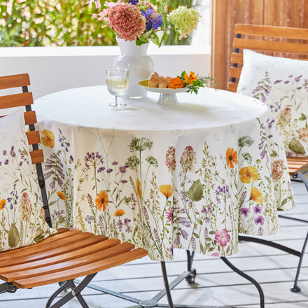 Frühlings-Tischdecke mit bunten Blumenprints Langlebiger, strapazierfähiger Baumwoll-Viskose-Mix Hochwertiger Digitaldruck Bringt Farbe auf den Tisch Die ersten Vorboten des Fühlings sind da! Decken Sie Ihren Tisch passend zum Wechsel der Jahreszeiten ein und stimmen Sie sich mit der Tischwäsche auf das Frühjahr ein. Auf der Tischdecke ist eine bunte Blumenwiese allover im Digitaldruck in leuchtenden Farben aufgedruckt worden. Einige Blüten und Insekten sind skizziert und geben der Tischwäsche ein künstlerisches Flair. Das Material aus einem Baumwoll-Viskose-Mix ist strapazierfähig und langlebig. Ein Tischläufer (Nr. 113HW07) und eine Kissenhülle mit Reißverschluss (Nr. 123HW03) ergänzen die Serie. 65 % Baumwolle, 35 % Viskose, Feinwäsche 40 °C.
