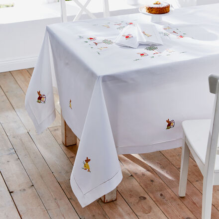 Feine Tischwäsche für die Osterzeit Erstklassige Tischdecke handbestickt Dekorativer Hohlsaum Dichtes Gewebe aus langstapeliger Baumwolle Plastische Hasenmotive in verschiedenen Sticktechniken Jedes Teil handgefertigt Sorgfältig gearbeitet mit doppelt gelegtem Saum und Couvertecken Tischdekoration vom Feinsten bietet die Premium-Tischwäsche, die sorgfältig mit Liebe zum Detail von Hand mit einem feinen Motive mit Hasen für die Osterzeit bestickt wurde Dafür wurden die flächigen Motive in die Servietten im Plattstich gestickt Feine Details wie die Blütenstengel sind wie gedrehte Schnüre im Stielstich gearbeitet So ist jede Tischdecke ein handwerkliches Unikat Je nach Lichteinfall erscheinen die Darstellungen geradezu plastisch und lebendig Die Tischwäsche ist aus einem sehr feinen und dichten Gewebe aus langstapeliger Baumwolle mit dekorativem Hohlsaum aus behutsam gezogenen Fäden gefertigt.