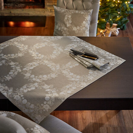 Weihnachts-Tischdecke mit Fleckschutz Jacquardgewebt mit Kranzmotiv und Glanzeffekt Festlich und stilvoll Teil einer Festtags-Tischwäsche Pflegeleicht und edel Der jacquardgewebte Stoff wird zu einer hochwertigen Weihnachts-Tischwäsche verarbeitet. Die Tischdecke mit kontrastreich eingewebtem Kranz-Sujet mit Glanzeffekten ist die ideale Basis für den festlich geschmückten Tisch. Die diskrete Fleckschutzausrüstung schützt den Stoff vor Flüssigkeiten und Schmutz. Der Lotuseffekt der feinen Beschichtung verhindert das Eindringen von Flüssigkeit in das Gewebe, dieses kann einfach abgewischt werden – und die Feier ohne große Aufregung weitergehen. Die Tischdecke gehört zu einer festlichen Tischwäsche-Serie mit Servietten, Tischläufer und Kissenhülle mit Reißverschluss. 58 % Polyester, 28 % Baumwolle, 8 % Polyacryl, 3 % Polyamid, 3 % sonstige Fasern. Feinwäsche 40 °C
