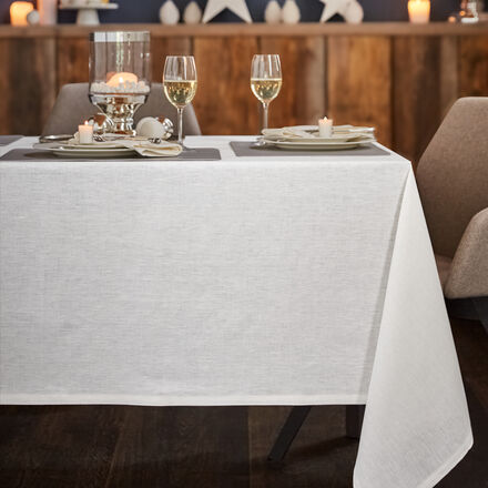 Hochwertige Leinen-Tischdecke Unifarben weiß Charakteristisch, eleganter Stoff Passt zu jedem Geschirr und allen Dekorationen Langlebige Qualität Festlich eleganter Look Die Wirkung der weißen Leinentischwäsche ist enorm: Aus Ihrem normalen Esstisch wird eine festliche Tafel. Leinentischwäsche ist die ursprünglichste Form von Tischschmuck und sieht von Natur aus edel und lässig elegant aus. Als unifarbene Tischwäsche mit dezenten Strukturen bietet sie eine erstklassige Unterlage für jedes Geschirr und lässt es perfekt zur Geltung kommen. Leinengewebe ist besonders reißfest und strapazierfähig und lässt sich in Waschmaschine und Trockner schnell für den nächsten Einsatz auffrischen. Sorgfältig gearbeitet und mit Gehrungssaum konfektioniert. Zur hochwertigen Leinen-Serie gehören noch 2 Servietten (Nr. 113HZ25), 2 Tischsets (Nr. 113HZ26) und ein Tischläufer (Nr. 113HZ27). 100 % Leinen, Maschinenwäsche 40 °C, trocknergeeignet.