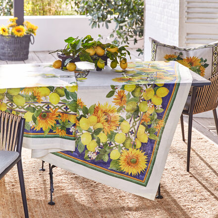 Tischdecke aus Qualitäts-Leinen In exquisiter Sonnenblumen- und Zitronen-Optik Mit abgepasstem Motiv auf dem Spiegel Besonders reißfest und strapazierfähig Mit hochwertig verarbeiteten Couvertecken Aus toskanischer Manufakturfertigung Hochwertiges Dessin, erlesene Leinenqualität und sorgfältigste Verarbeitung machen die mediterrane Tischwäsche aus reinem Leinenstoff zu einer noblen Kollektion Das Motiv ist wie ein Gemälde von einem Rahmen umgeben und detailreich mit prachtvollen Sonnenblumen und Zitronen ausgeschmückt Der hochwertige, abgepasste Druck auf der Tischdecke verspricht beständige Farbbrillanz auf dem natürlich glänzenden Gewebe Inmitten des weißen Spiegels wird das umlaufende Motiv in Form eines Rankgitters aufgeriffen Die Tischwäsche-Serie besteht aus Servietten, Tischsets, Tischläufer, Tischdecke und Kissenhüllen und wird in einer toskanischen Manufaktur gefertigt Ein vielseitig einsetzbares Leinen-Plaid (Nr.