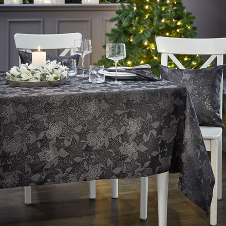 Festliche Tischdecke mit eingewebtem Sternendekor Eingearbeitete glänzende Effektgarne Spezielle Fleckschutzausstattung Edel verarbeitet mit Couvertsaum Formstabil und strapazierfähig Die kontrastreich in die Tischdecke eingewebten Sterne glitzern im Lichtschein festlich durch die glänzenden Effektgarne. Die Tischwäsche mit üppigem Sternendekor gibt Ihrer Festtagstafel eine glanzvolle Basis. Das wunderbar fließende Gewebe mit weicher Haptik ist mit einem speziellen Fleckschutz ausgestattet, sodass Flüssigkeiten einfach abperlen und vorsichtig abgetupft werden können. Edel verarbeitet mit Couvertsaum, formstabil und strapazierfähig. Gehört zu einer umfangreichen Tischwäsche-Serie für die Weihnachtszeit. 58 % Polyester, 28 % Baumwolle, 8 % Polyacryl, 3% Polyamid, 3 % Sonstige Fasern, Schonwäsche 40 °C. Mit Fleckschutz.