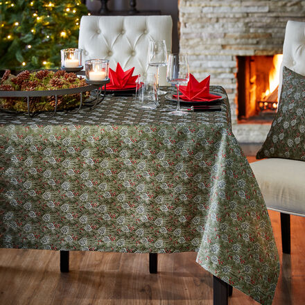 Exklusive Julia Grote Winter-Tischwäsche Tischdecke mit winterlichem Tannenzapfen-Muster Grafisch detailreiche, naturgetreue Umsetzung Schlichte und charmante Weihnachts-Tischwäsche Harmoniert mit vielen Servicen und Dekorationen Die für Julia Grote entworfene Tischwäsche-Serie ist inspiriert von einem Spaziergang durch den winterlichen Tannenwald Die jacquardgewebte Tischdecke in vier verschiedenen Größen schmückt ein charmantes Allover-Motiv mit Tannenzweigen, dekorativen Zapfen und kleinen, roten Beeren Die Darstellung auf der winterlichen Tischwäsche ist grafisch detailreich und naturgetreu umgesetzt Der khakifarbene Untergrund als warme Erdfarbe hat eine ruhige Ausstrahlung und lässt sich hervorragend mit anderen Farben kombinieren Im Mix mit zurückhaltenden Farben wirkt Khaki edel und minimalistisch, zusammen mit kräftigen Farben wie Rot oder Grün wird es richtig festlich, das prädestiniert die Tischwäsche für Weihnachten und die Winterzeit.