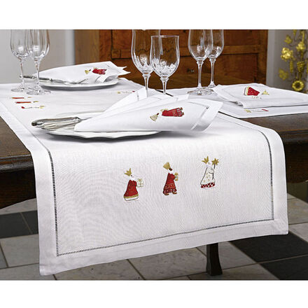 Wenige Stickerinnen beherrschen heute nochdiese kunstvolle, überaus aufwändige Handarbeitstechnik.Jedes Teil wird mit viel Erfahrungund Liebe zum Detail voller Sorgfalt angefertigt.Sogenannter Plattstich, eine schon im Mittelalterverwendete Technik, wird für flächige Darstellungengenutzt. Stielstich für Linien wirkt wieeine gedrehte Schnur. Unterschiedlicher Lichteinfallsteigert die lebendige, plastische Wirkung.Bestickt wird elegantes, weich fließendes Gewebeaus langstapeliger Baumwolle, das ein Hohlsaumaus behutsam gezogenen Fäden ziert. Ein doppeltgelegter Saum mit diagonal angelegten Eckenin Couverttechnik schließt die hochwertigeTischwäsche ab. Jede Decke ist ein von Handgefertigtes Unikat. 100 % Baumwolle, 160 g/m²,Maschinenwäsche 30 °C.