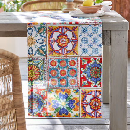 Mediterraner Tischläufer aus toskanischer Manufaktur Exquisite, farbenfrohe Kachel-Optik im Camastra-Dessin Baumwollstoff in Panamabindung im typischen Flecht-Look Besonders reißfest und strapazierfähig Sorgfältige Verarbeitung In diesem mediterranen Tischläufer aus toskanischer Manufakturfertigung ergänzen sich Dessin, Material, Webart und Verabreitung zu einer exquisiten Tafeldekoration Der robuste Baumwollstoff erhält durch das Weben in Panamabindung seinen charakteristischen Flecht-Look Diese Bindungsart ist eine abgewandelte Form der Leinwandbindung und wird auch Würfel- oder Mattenbindung genannt, weil das Gewebe eine würfelartige oder schachbrettartige Optik hat Das Camastra-Design ist von der gleichnamigen sizilianischen Stadt inspiriert und zeigt unterschiedliche Muster der typisch handgefertigten Keramikkacheln Der hochwertige Druck lässt die farbfrohen Motive auf dem natürlich glänzenden Gewebe in dauerhafter Brillanz erstrahlen.