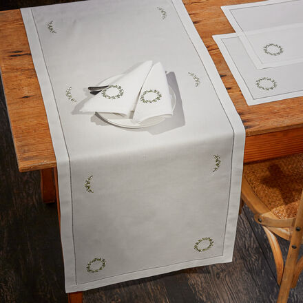 Handbestickter, feiner Hohlsaum-Tischläufer Mehrfarbiger Kranz in verschiedenen Sticktechniken Plastische Darstellung der Motive Jedes Teil ein Unikat Sorgfältig gearbeitet In verschiedenen Sticktechniken wird der Weihnachts-Tischläufer der außergewöhnlichen Kranz-Kollektion sorgfältig und mit Liebe zum Detail handbestickt Filigrane Elemente entstehen im „Stielstich“ und wirken wie gedrehte Schnüre Flächige Motive wie die Blätter werden mit dem seit dem Mittelalter bekannten „Plattstich“ angefertigt Je nach Lichteinfall wirken die zarten, perfekt gestickten Ornamente plastisch und zum Anfassen echt Der Tischläufer ist aus einem feinen und dichten Gewebe aus langstapeliger Baumwolle gefertigt Handarbeit in Perfektion mit aufwendig feinstichig gearbeiteten Hohlsäumen und doppelt gelegten Säumen und Ecken in Couverttechnik Jedes Teil ist ein handgefertigtes Unikat Zur edlen Weihnachts-Tischwäsche handbestickt mit Hohlsaum gehören noch vier Servietten (Nr.