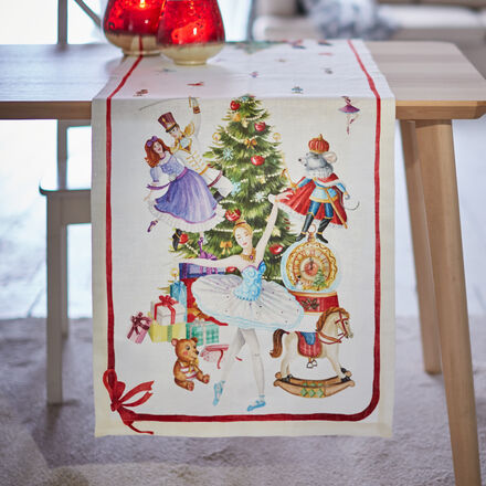 Tischläufer aus Qualitäts-Leinen Mit weihnachtlichen Szenen aus dem „Nussknacker“ Besonders reißfest und strapazierfähig Mit hochwertig verarbeiteten Couvertecken Aus toskanischer Manufakturfertigung Farbenfroh und fantasievoll haben die Designer der italienischen Textilmanufaktur Szenen des beliebten Weihnachtsballetts „Der Nussknacker“ für die Weihnachts-Tischwäsche adaptiert. Auf dem natürlich glänzenden Leinengewebe kommen die Figuren prachtvoll zur Geltung und geben Ihrer Weihnachtstafel ein festliches Gewand. Durch die Verwendung der Flachsfaser bleibt der dekorative Tischläufer besonders unnachgiebig, reißfest und behält auch nach vielen Wäschen seine brillanten Farben. Das werden auch zukünftige Generationen zu schätzen wissen. Zur Tischwäscheserie gehören noch zwei Tischsets (Nr. 113HZ10) sowie eine Tischdecke in 4 Formaten. 100 % Leinen, bedruckt. Maschinenwäsche 40 °C.