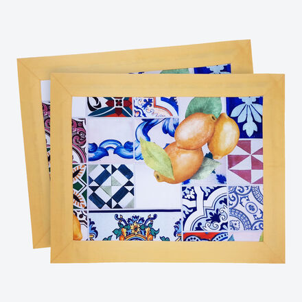 Inspiriert von portugiesischer und spanischer Fliesenmalerei entstand das farbenfrohe Dessin dieser sommerlichen Tischwäsche. Dank modernem Digitaldruckverfahren plastisch erscheinende Zitronen erhöhen diese mediterrane Anmutung noch. Das in robuster Panamabindung gearbeitete Baumwollgewebe bewahrt auch nach vielen Wäschen seine Form und Farbbrillanz. Dafür garantiert die erstklassige Verarbeitung in deutscher Atelierfertigung. 100 % Baumwolle, ca. 360 g/m², Maschinenwäsche 30 °C. Sondergrößen auf Anfrage möglich. Julia Grote Exklusiv
