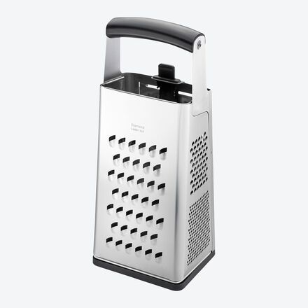 Messerscharfe Edelstahl-Reibe 7 Reibarten in einem Vierkanthobel 3-stufig verstellbarer V-Hobel Reibt und schneidet selbst hartes Gemüse mühelos Extra feiner Bereich für Muskat, Zitronenschale, Ingwer Messerscharfe Laser-Cut-Reibzähne verarbeiten sicher und kraftsparend auf der Grobreibe Obst, Gemüse, harte Süßkartoffeln. 2-Wege Reibflächen verwandeln Hartkäse oder Schokolade zu zarten Flocken. Feinreiben dienen dem Abrieb von Zitronenschale, Muskat, Ingwer. Extra scharfer 3-stufig verstellbarer V-Hobel für 1,5/,2,5/3,5 mm dünne Scheiben. Standsicherheit garantiert der rutschfeste, abnehmbare Boden-Auffangdeckel. Edelstahl, Kunststoff, Klingenstahl, 12 x 9 x 29 cm (B/T/H), zum Erhalt der Schärfe Handwäsche empfohlen.