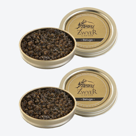 Wildkaviar aus dem Kaspischen Meer war stets begehrt. Um das Überleben wild lebender Störe zu sichern, erlaubt die internationale Artenschutzkonferenz nur den Export aus Zucht. Unser Kaviar kommt aus nachhaltigen, kontrollierten, naturnahen Aquafarmen. Diese preisgekrönte Delikatesse hat sich in unzähligen Blinddegustationen auch gegen Wildkaviar mühelos durchgesetzt. Alle Sorten mild gesalzen (Malossol), 3 Monate haltbar. ZwyerCaviar Beluga: Der König des Kaviars. Rogen von einer Kreuzung aus Beluga- und Baeri-Stör, sehr dünnschalig, von außergewöhnlicher Größe (ca. 3,5 mm), schimmert stahlgrau. Milder, feincremiger Geschmack, leichte Butternote.